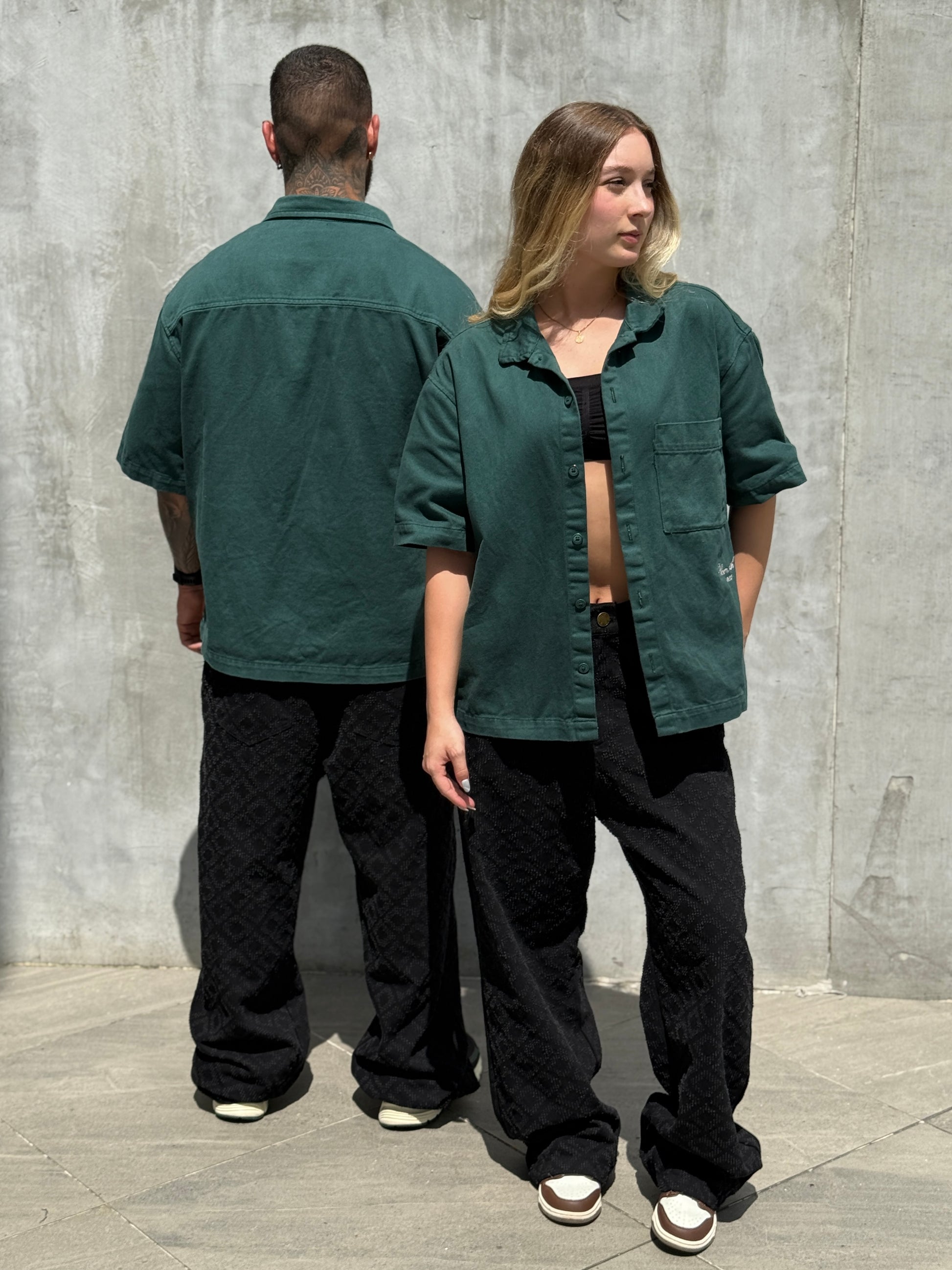 Camisa Denim en color verde, molde Semi-Oversized, elaborado en tela 100% algodón (10,5 onz), Bordado en la parte inferior izquierda "Bloom, with grace.